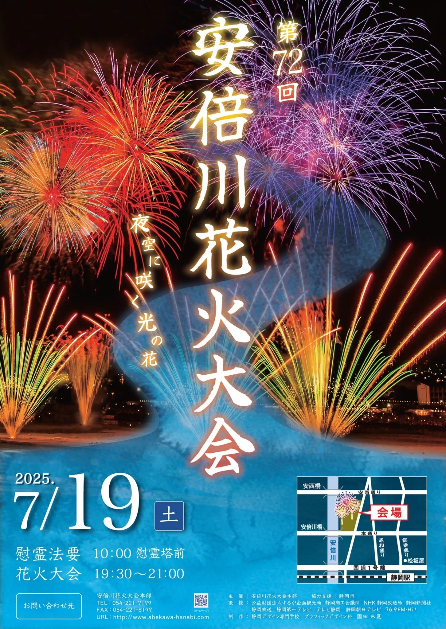 安倍川花火大会 イベント 2026.02.26 1万発以上の大迫力花火が夜空を彩る、静岡を代表する夏の風物詩 季節:夏 開催月:7月 開催日:7/18 区:葵区 会場:安倍川河川敷 イベント種別:伝統・地場産業, 大型イベント, 子ども・家族と https://www.abekawa-hanabi.com/