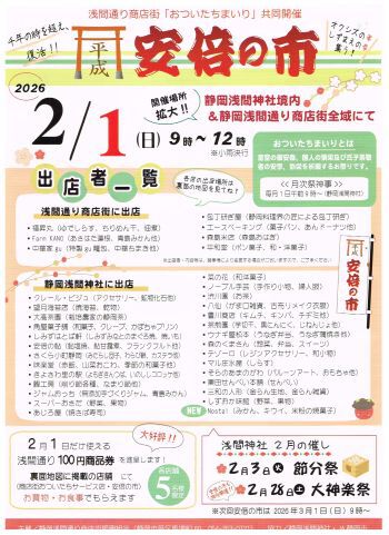平成安倍の市(静岡浅間通り商店街) イベント 2026.02.01 おいしい発見と楽しい交流が同時に楽しめる朝市 季節:通年 開催月:10月, 11月, 12月, 1月, 2月, 3月, 4月, 5月, 6月, 7月, 8月, 9月, 毎月 区:葵区 会場:静岡浅間通り商店街 イベント種別:マルシェ, 商店街イベント, 子ども・家族と https://www.sengendori.com/2023nagamasa.pdf