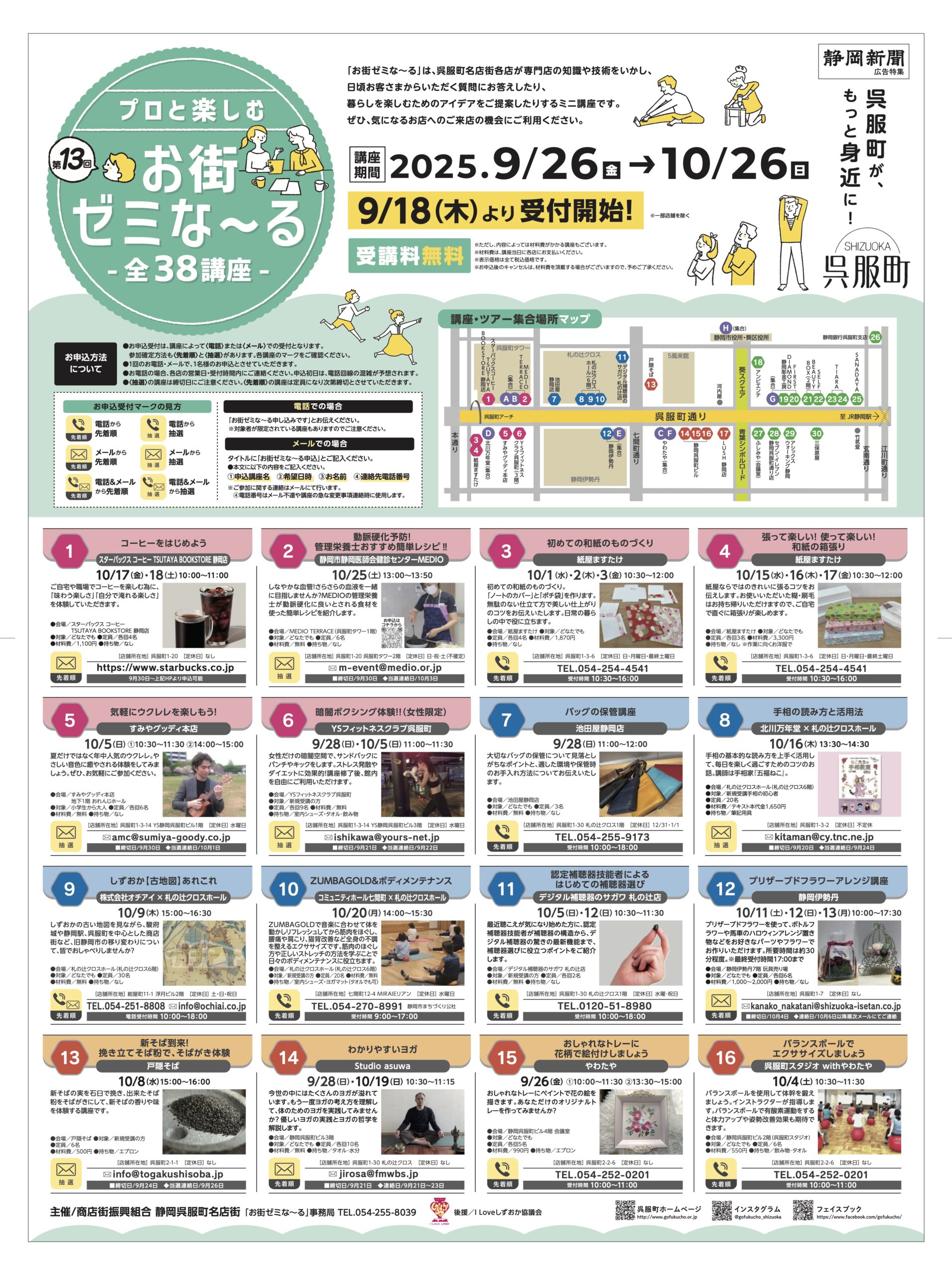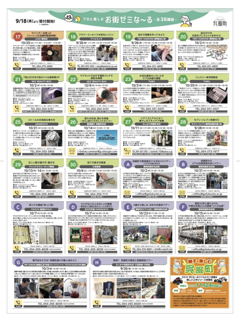 プロと楽しむお街ゼミな~る(静岡呉服町名店街) イベント 2026.02.25 呉服町の専門店店主と一緒に、買い物しながら楽しく学べるまち歩き型ミニ講座 季節:夏 開催月:9月 開催日:9/26~10/26 区:葵区 会場:静岡呉服町名店街 イベント種別:体験, 商店街イベント, 大人向け https://gofukucho.or.jp
