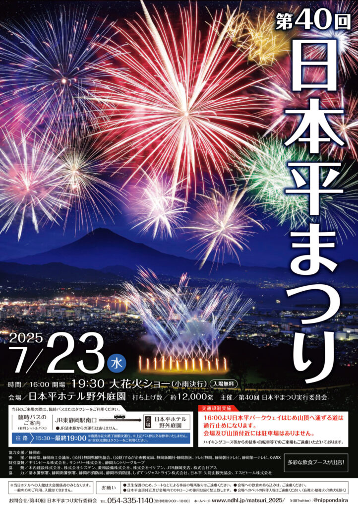 日本平まつり(日本平ホテル) イベント 2026.02.24 音楽と光にシンクロするデジタル花火を、芝生に寝ころび真上で体感できる、日本平ならではの花火ショー 季節:夏 開催月:7月 開催日:7/23 区:清水区 会場:日本平ホテル イベント種別:伝統・地場産業, 大型イベント, 子ども・家族と https://hanabi.walkerplus.com/detail/ar0622e00882/
