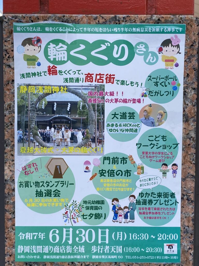 輪くぐりさん(静岡浅間通り商店街、静岡浅間神社) イベント 2026.02.24 浅間通りから浅間神社まで、茅の輪くぐりで無病息災を願い、街と神社が一体となって賑わう初夏の風物詩。 季節:夏 開催月:6月 開催日:6/30 区:葵区 会場:静岡浅間神社, 静岡浅間通り商店街 イベント種別:伝統・地場産業, 子ども・家族と https://www.sengendori.com/